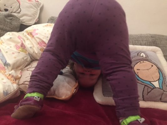 Eigentlich sollst Du nicht herum toben sondern lieber ruhig Bücher anschauen, damit Du Dich schnell von deiner Gehirnerschütterung erholst. Aber Nein… Lea möchte lieber Purzelbäume machen 😜.